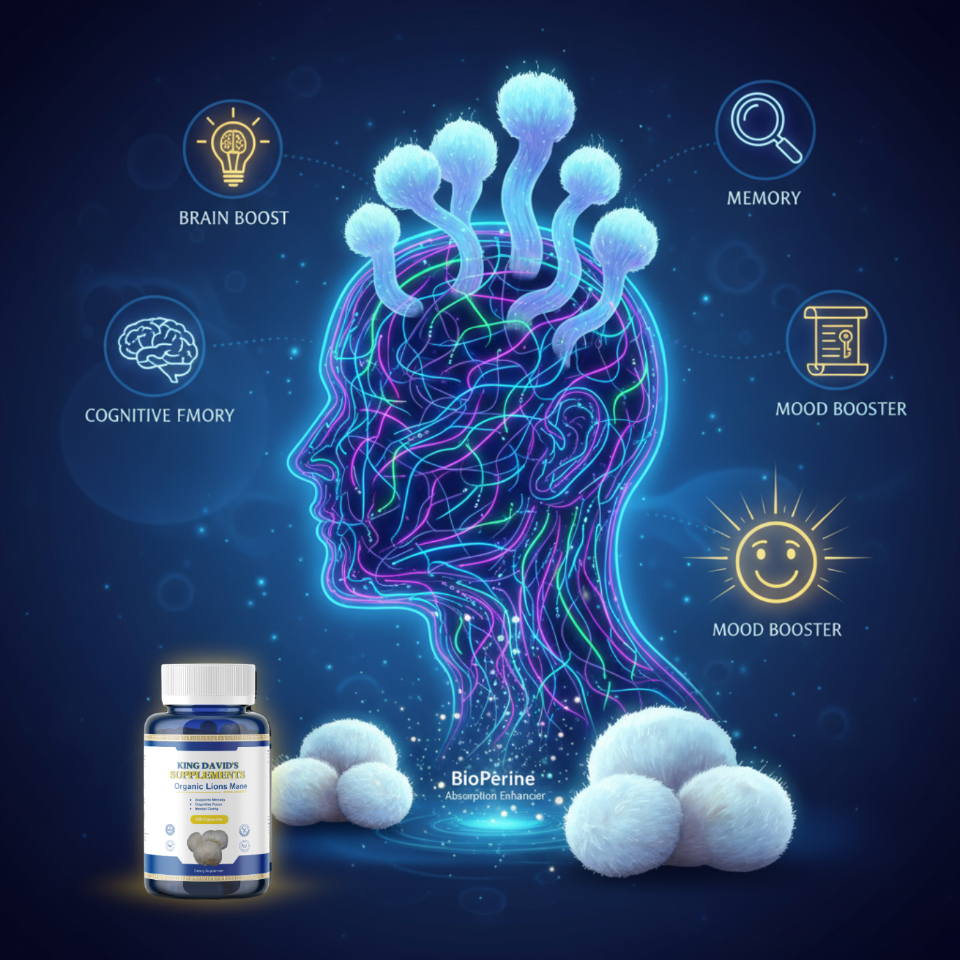 1. Boosts Cognitive Function: Supports memory, focus, and mental clarity by stimulating nerve growth and neuron regeneration.